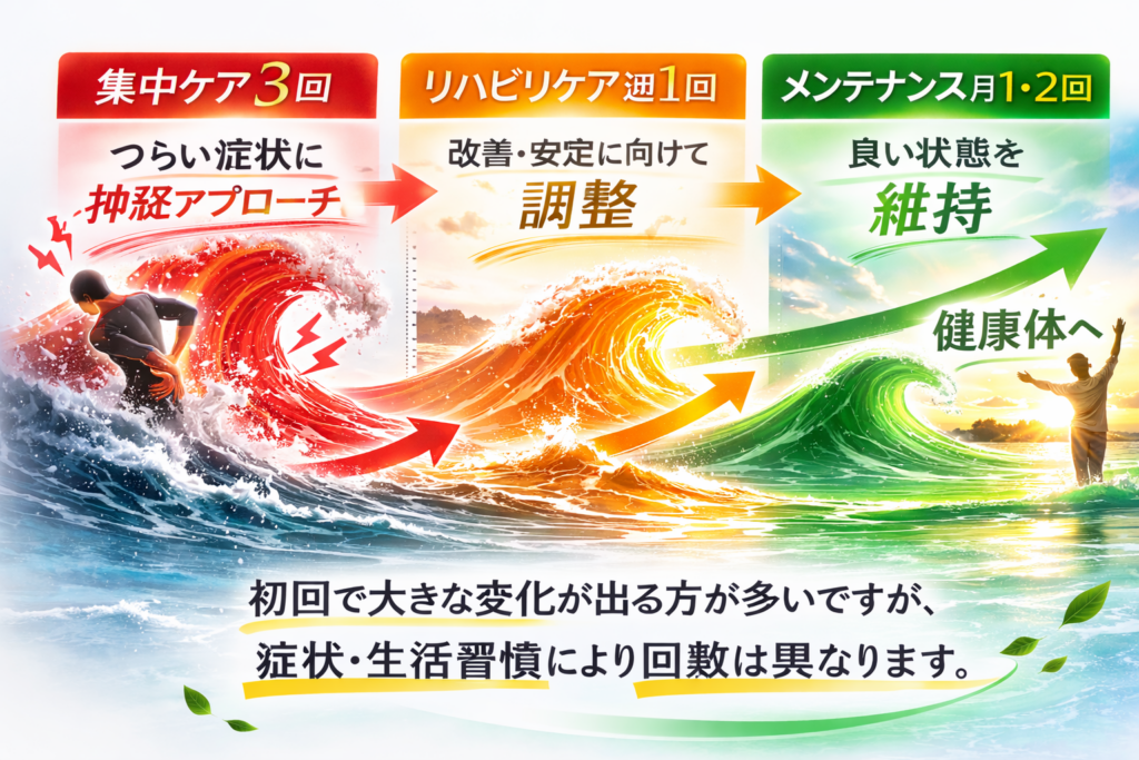 痛みがある場合は集中ケア3回連続、リハビリケアは週1回、メンテナンスは月に1~2回の通院を推奨していますが、症状や個人差によって異なります。